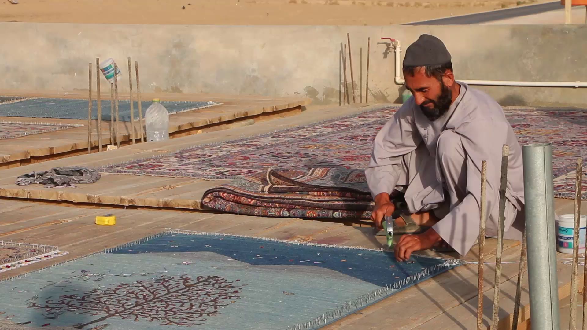 د فاریاب په اندخوی ولسوالۍ کې د افغانۍ غالیو اوبدلو یوه کارخونه کې دا مهال لسګونه کسان په کار بوخت دي.